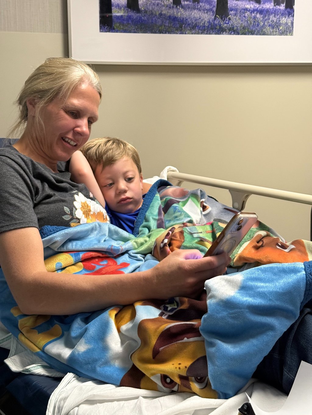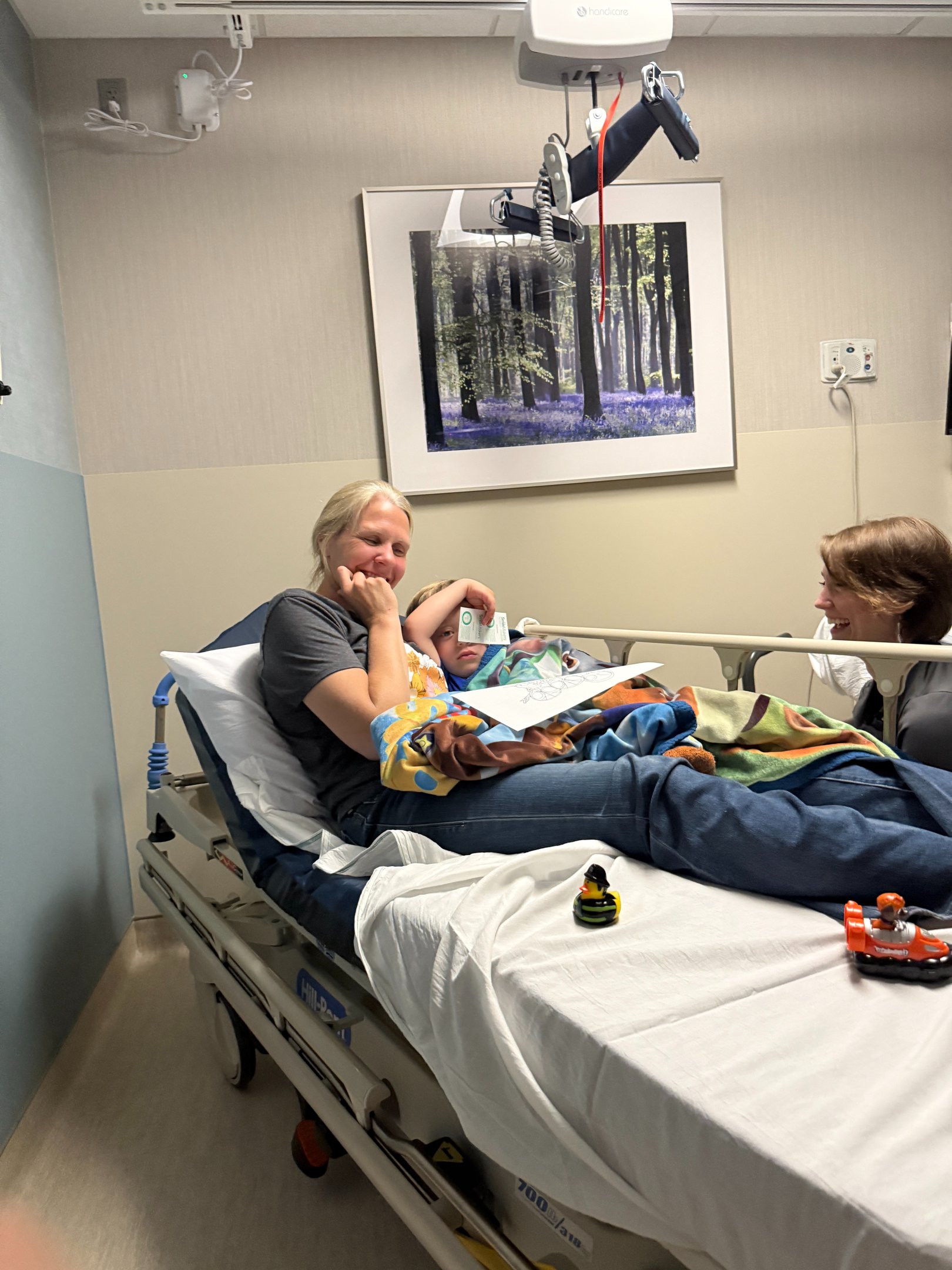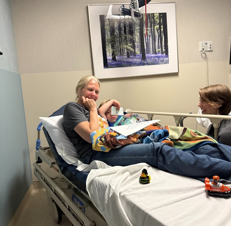 We made it to Mayo this morning and found where we were supposed to be, and the lady at the desk greeted us by saying, "Is this Gage? We have been waiting for him!" We were almost 30 minutes early for our appointment, and we ended up waiting for several minutes while they arrived to pick us up. We went back to the room and realized that the nurse anesthetist was the same one who had taken care of Gage before, and she remembered him! They gave Gage some gas that made him go to sleep (as he screamed and fought the mask). While Gage was sleeping, they put an IV in his arm and took some blood for labs. The blood lab lady compared herself to the tooth fairy and said that she took Gage's blood and left him with a toy duck. After a while, we were taken to another part of the hospital where the scans would be performed, and at this point, Gage was awake. They administered some contrast agent through Gage's IV, and then we had to wait for about an hour before they could perform the scans. They finally came and got Gage for the scan and put him back to sleep, and then we were taken back to the room where we were with him at the beginning. After Gage was finished, they brought him back to his room, and we waited with Nurse Tara for Gage to wake up. So, the scans are finished (this time), and now we will meet with Gage's oncologist tomorrow morning to discuss the results.